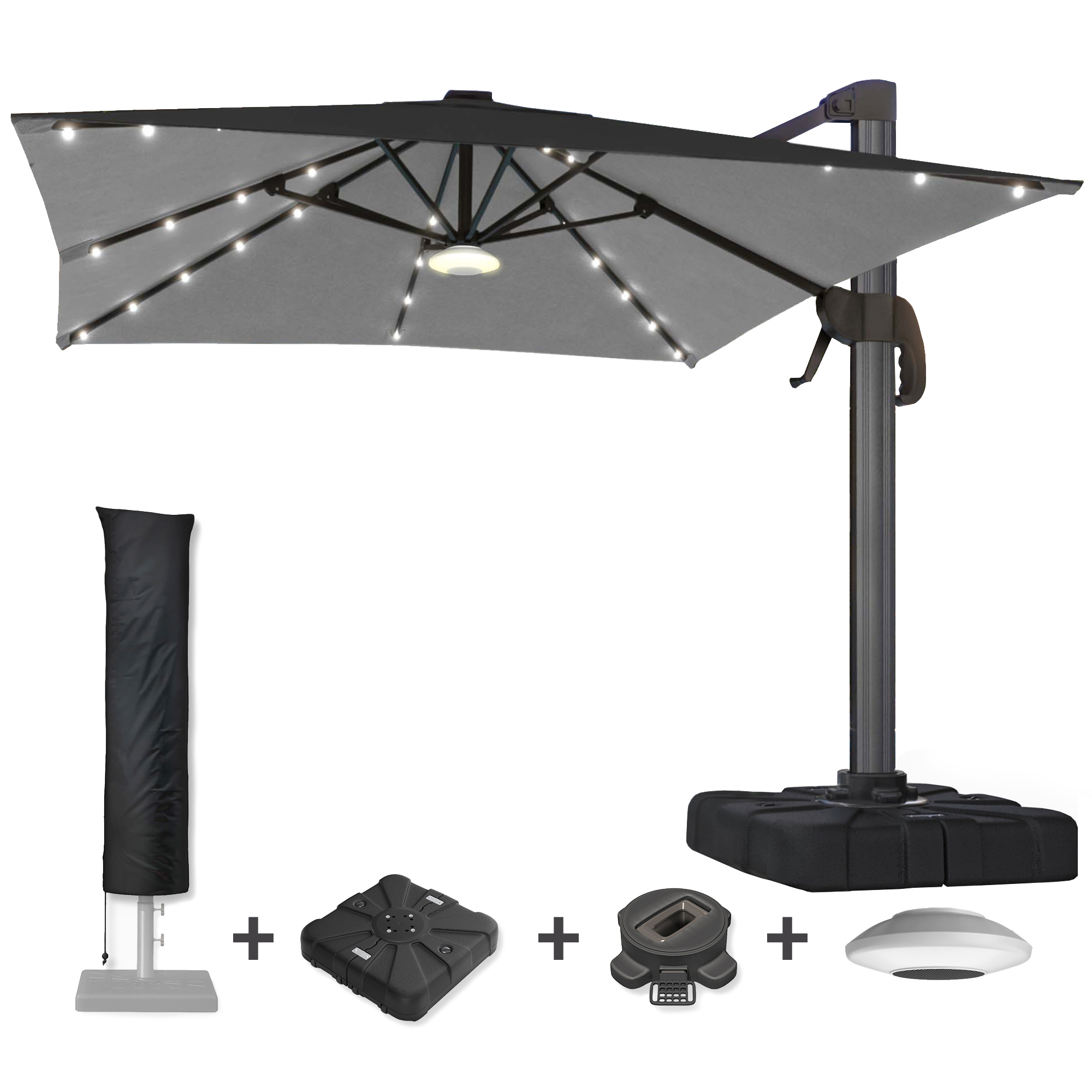 SUN LUIS | Sonnenschirm | Quadratisch | B:T 300 x 300 cm | Schwarz | LED | +Ständer, Schwenkfuß & Hülle