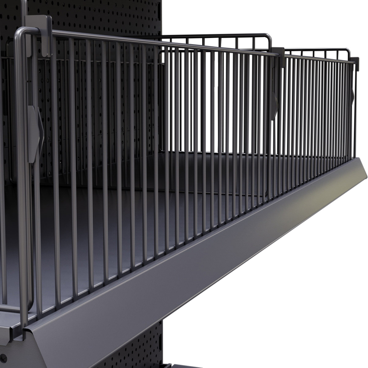 Our front grids are an optimal accessory for our wall and centre shelving units. These shelves always cut a fine figure and impress with their functional diversity, as they can be equipped with countless accessories and shelves. The quality of our accessories is outstanding due to excellent workmanship and extremely high-quality materials. Our shelves have a groove at the front and back so that a front grille can be coupled to both sides, which would then create a kind of fenced-in box.This allows you to put together your own individual shelf, which is optimally adapted to the needs of your business. Be it with the help of extra shelves or high-quality dividers and front grids - in our range you will find the perfect shelving system for everyone.