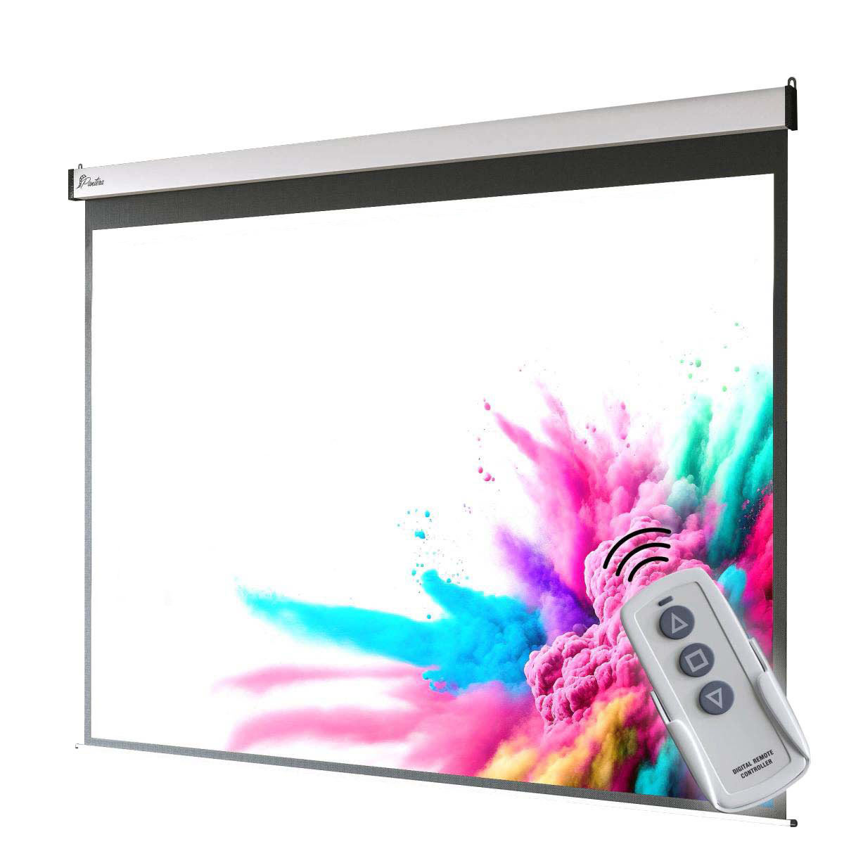 Silencioso y potenteGracias a su mayor par de torsión, el potente motor no sólo es duradero y silencioso, sino también respetuoso con el tejido de la pantalla. Los componentes internos reforzados garantizan un desenrollado suave y un posicionamiento preciso de la tela. Los diferentes formatos son posibles gracias al bloqueo continuo. Disfrute de la comodidad de una pantalla de proyección eléctrica mediante un cómodo control a través del mando a distancia por radio o del interruptor de pared suministrado.
