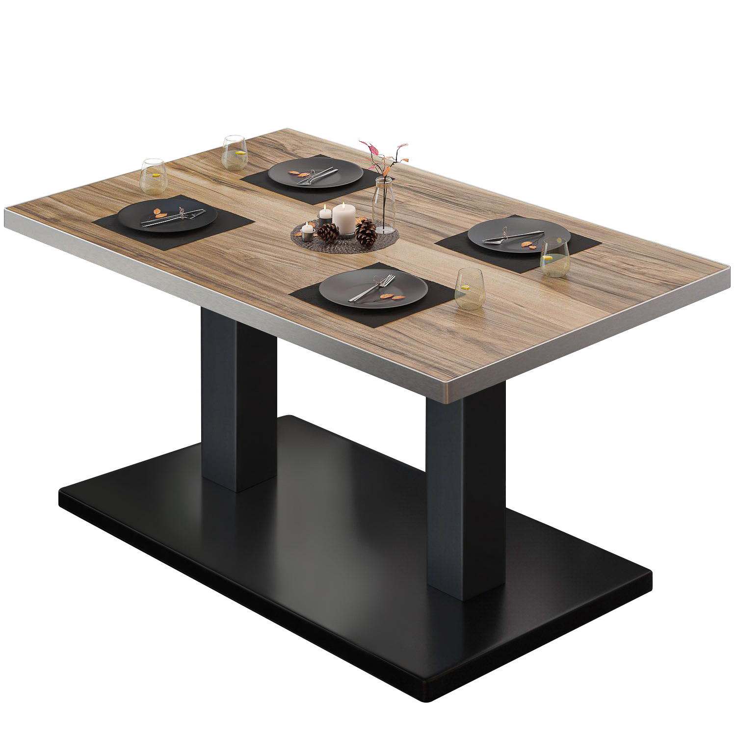 Melaminhartsbeläggningar pressas på kärnskivan med hjälp av värme, vilket gör att melaminskiktet smälter samman med kärnskivan. Detta förfarande säkerställer att restaurangbordsskivan har en mycket högre nötningsbeständighet och är också utmärkt skyddad mot fukt.